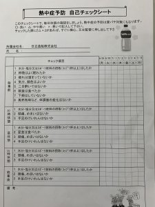 ①熱中症予防、自己管理チェックシートで毎日体調の確認 日/4回(始業前、10時休憩時、昼休憩時、15時休憩時、終業後)少しでも体調不良があれば、管理者、監督に報告し適切な指示を受ける。熱中症が起こる前の対策として必ず各自チェックを行う。